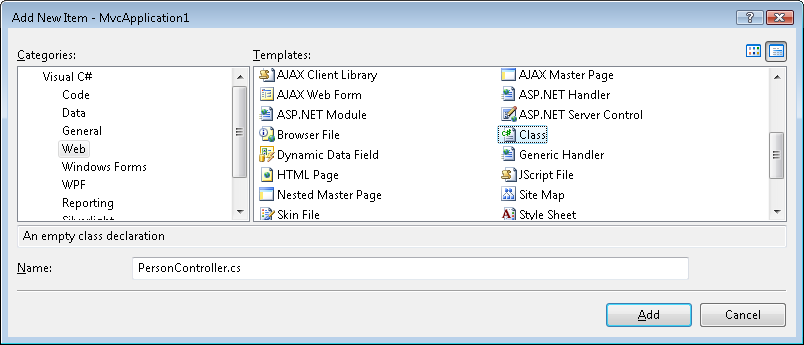 - Nennen Sie die neue Klasse PersonController.cs, und klicken Sie auf die Schaltfläche Hinzufügen .