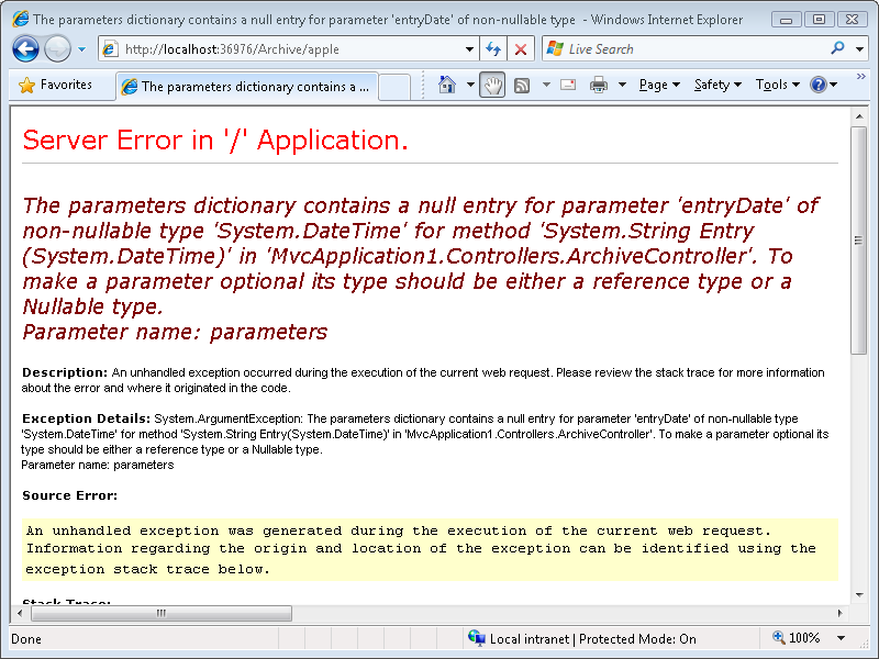 Beachten Sie, dass die Entry()-Methode in Listing 2 einen Parameter vom Typ DateTime akzeptiert. Das MVC-Framework ist intelligent genug, um das Eingabedatum aus der URL automatisch in einen DateTime-Wert zu konvertieren. Wenn der Eingabedatumsparameter aus der URL nicht in eine DateTime konvertiert werden kann, wird ein Fehler ausgelöst (siehe Abbildung 1).