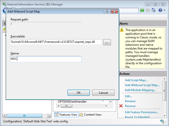 Die zweite Option besteht darin, eine so genannte Platzhalterskriptzuordnung zu erstellen. Mit einer Wildcard-Skriptzuordnung können Sie jede Anforderung dem ASP.NET Framework zuordnen.