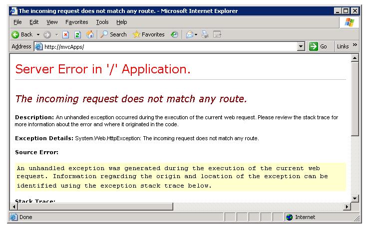 Nachdem Sie Wildcard-Skriptzuordnungen aktiviert haben, müssen Sie die Routingtabelle in der Datei Global.asax so ändern, dass sie eine Stammroute enthält. Andernfalls erhalten Sie die Fehlerseite in Abbildung 5, wenn Sie eine Anforderung für die Stammseite Ihrer Anwendung stellen. Sie können die geänderte Datei Global.asax in Listing 4 verwenden.