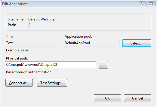 Beachten Sie, dass Sie den Anforderungsverarbeitungsmodus im Dialogfeld Anwendung bearbeiten ändern können. Klicken Sie auf die Schaltfläche Auswählen, und ändern Sie den der Anwendung zugeordneten Anwendungspool. Beachten Sie, dass beim Ändern einer ASP.NET Anwendung vom klassischen in den integrierten Modus Kompatibilitätsprobleme auftreten. Weitere Informationen finden Sie in den folgenden Artikeln: