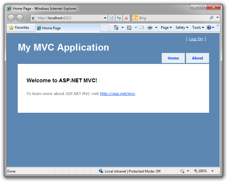 Diese Standardvorlage bietet zwei Seiten zum Besuchen und eine einfache Anmeldeseite. Lassen Sie uns die Funktionsweise dieser Anwendung ändern und dabei ein wenig über ASP.NET MVC lernen. Schließen Sie Ihren Browser, und lassen Sie code ändern.