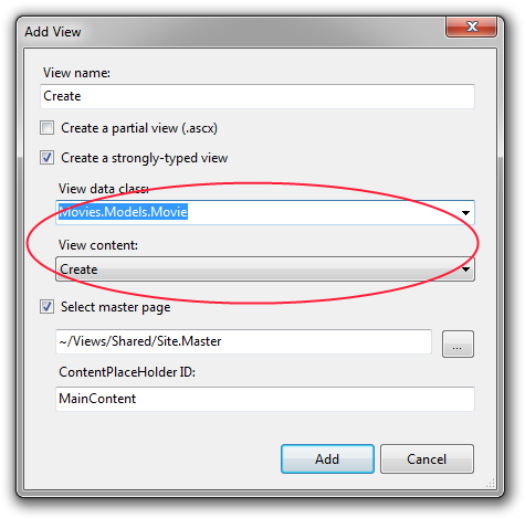 Nachdem Sie auf die Schaltfläche Hinzufügen geklickt haben, wird die Vorlage \Movies\Create.aspx View für Sie erstellt. Da wir in der Dropdownliste "Inhalt anzeigen" die Option "Erstellen" ausgewählt haben, hat das Dialogfeld Ansicht hinzufügen automatisch einige Standardinhalte für uns "gerüstet". Das Gerüst hat ein HTML-Formular <>erstellt, einen Ort für Validierungsfehlermeldungen, und da das Gerüstbau über Filme weiß, wurden Label und Felder für jede Eigenschaft unserer Klasse erstellt.