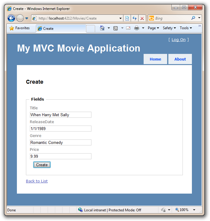 Wenn wir auf die Schaltfläche Erstellen klicken, werden die Daten in diesem Formular (über HTTP POST) an die soeben erstellte /Movies/Create-Methode zurückgestellt. Genau wie wenn das System die Parameter "numTimes" und "name" automatisch aus der URL genommen und sie Parametern einer Methode zuvor zugeordnet hat, übernimmt das System automatisch die Formularfelder aus einem POST und zuordnen sie einem Objekt. In diesem Fall werden Werte aus Feldern in HTML wie "ReleaseDate" und "Title" automatisch in die richtigen Eigenschaften eines neuen instance eines Films eingefügt.