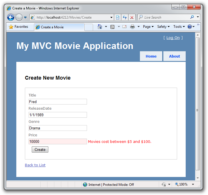 Re-Run Ihre Anwendung, und versuchen Sie, einen Film mit einem Preis von über 100 einzugeben. Nachdem Sie das Formular übermittelt haben, wird eine Fehlermeldung angezeigt. Der Fehler wird auf der Serverseite abgefangen und tritt auf, nachdem das Formular POSTed wurde. Beachten Sie, dass ASP.NET integrierten HTML-Hilfsprogramme von MVC intelligent genug waren, um die Fehlermeldung anzuzeigen und die Werte für uns in den Textfeldelementen beizubehalten: