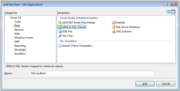 Unser MVC-Modell enthält LINQ to SQL Klassen, die die tblMovie-Datenbanktabelle darstellen. Die einfachste Möglichkeit zum Erstellen dieser LINQ to SQL Klassen besteht darin, mit der rechten Maustaste auf den Ordner Models zu klicken, Hinzufügen, Neues Element auszuwählen, die Vorlage LINQ to SQL Klassen auszuwählen, den Klassen den Namen Movie.dbml zu geben und auf die Schaltfläche Hinzufügen zu klicken (siehe Abbildung 4).