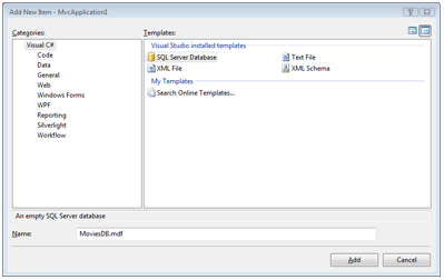 In diesem Tutorial erstellen wir eine einfache Movie-Datenbankanwendung, um zu veranschaulichen, wie Sie Modellklassen erstellen können. Der erste Schritt besteht darin, eine neue Datenbank zu erstellen. Klicken Sie im fenster Projektmappen-Explorer mit der rechten Maustaste auf den Ordner App_Data, und wählen Sie die Menüoption Hinzufügen, Neues Element aus. Wählen Sie die Vorlage SQL Server Datenbank aus, geben Sie ihr den Namen MoviesDB.mdf, und klicken Sie auf die Schaltfläche Hinzufügen (siehe Abbildung 1).