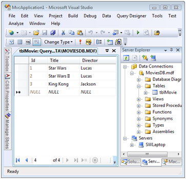 Nachdem wir nun über unsere LINQ to SQL Klassen verfügen, können wir diese Klassen verwenden, um Daten aus der Datenbank abzurufen. In diesem Abschnitt erfahren Sie, wie Sie LINQ to SQL Klassen direkt innerhalb einer Controlleraktion verwenden. Die Liste der Filme aus der tblMovies-Datenbanktabelle wird in einer MVC-Ansicht angezeigt.