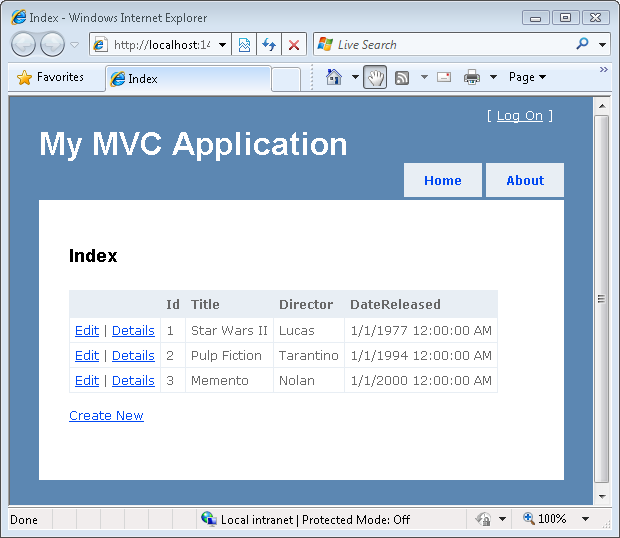 In der Indexansicht werden alle Filmdatensätze aus der Datenbanktabelle "Filme" in einer HTML-Tabelle angezeigt. Die Ansicht enthält eine For Each-Schleife, die jeden Film durchläuft, der durch die ViewData.Model-Eigenschaft dargestellt wird. Wenn Sie Ihre Anwendung ausführen, indem Sie die F5-TASTE drücken, wird die Webseite in Abbildung 11 angezeigt.