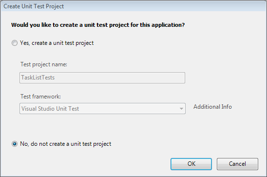 Immer wenn Sie ein neues MVC-Webanwendungsprojekt erstellen, fordert Visual Studio Sie auf, ein separates Komponententestprojekt zu erstellen. Das Dialogfeld in Abbildung 2 wird angezeigt. Da wir in diesem Lernprogramm keine Tests erstellen werden, weil Zeiteinschränkungen (und ja, wir sollten uns ein wenig schuldig fühlen), wählen Sie die Option "Nein " aus, und klicken Sie auf die Schaltfläche "OK ".