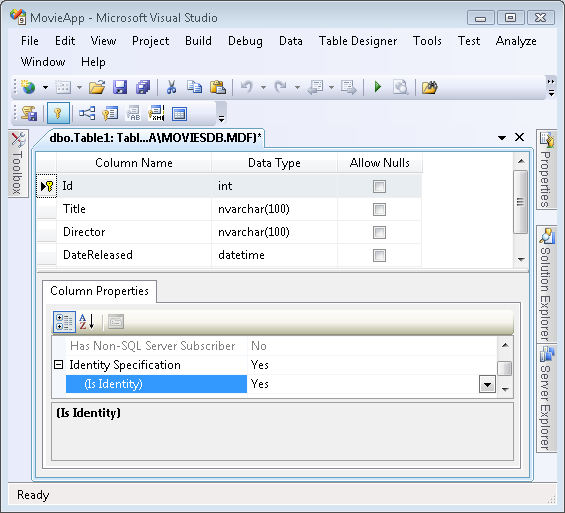 Die erste Spalte, die Spalte "ID", verfügt über zwei spezielle Eigenschaften. Zuerst müssen Sie die ID-Spalte als Primärschlüsselspalte markieren. Nachdem Sie die Spalte "ID" ausgewählt haben, klicken Sie auf die Schaltfläche "Primärschlüssel festlegen" (es ist das Symbol, das wie ein Schlüssel aussieht). Zweitens müssen Sie die ID-Spalte als Identitätsspalte markieren. Scrollen Sie im Eigenschaftenfenster Spalte nach unten zum Abschnitt "Identitätsspezifikation", und erweitern Sie ihn. Ändern Sie die Is Identity-Eigenschaft in den Wert "Ja". Wenn Sie fertig sind, sollte die Tabelle wie In Abbildung 4 aussehen.