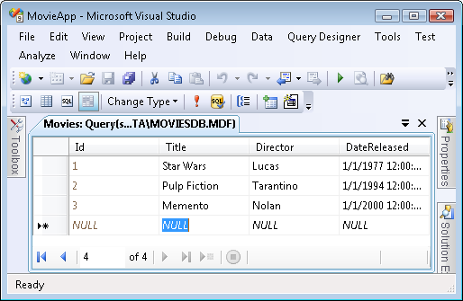 Nachdem Sie die Tabelle erstellt haben, fügen Sie der Tabelle einige Filmeinträge hinzu. Klicken Sie im Fenster "Server-Explorer" mit der rechten Maustaste auf die Tabelle "Filme", und wählen Sie die Menüoption " Tabellendaten anzeigen" aus. Geben Sie eine Liste Ihrer Lieblingsfilme ein (siehe Abbildung 5).