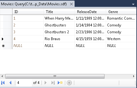 Es gibt zwei Tabellen, eine für den Movie Entitätssatz und dann die EdmMetadata Tabelle. Die EdmMetadata Tabelle wird vom Entity Framework verwendet, um zu bestimmen, wann das Modell und die Datenbank nicht synchronisiert sind.