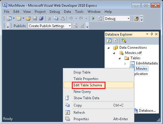 Wenn beim Doppelklicken auf "Movies.sdf" eine Fehlermeldung angezeigt wird, stellen Sie sicher, dass Sie SQL Server Compact 4.0 (Runtime + Tools-Unterstützung) installiert haben. (Links zur Software finden Sie in der Liste der Voraussetzungen in Teil 1 dieser Lernprogrammreihe.) Wenn Sie die Version jetzt installieren, müssen Sie Visual Web Developer schließen und erneut öffnen.