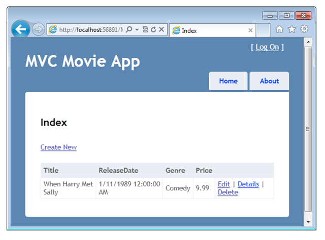 Beachten Sie, wie der Code ein List Objekt erstellt, wenn es die View Hilfsmethode in der Index Aktionsmethode aufruft. Der Code übergibt dann diese Movies Liste vom Controller an die Ansicht: