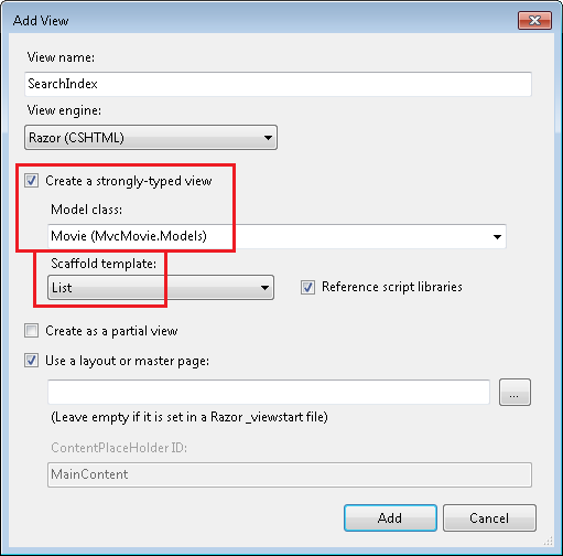 Jetzt können Sie die Ansicht implementieren, in der SearchIndex das Formular für den Benutzer angezeigt wird. Klicken Sie mit der rechten Maustaste in die SearchIndex Methode, und klicken Sie dann auf "Ansicht hinzufügen". Geben Sie im Dialogfeld "Ansicht hinzufügen" an, dass Sie ein Movie Objekt als Modellklasse an die Ansichtsvorlage übergeben möchten. Wählen Sie in der Gerüstvorlagenliste "Liste" die Option "Liste" aus, und klicken Sie dann auf "Hinzufügen".