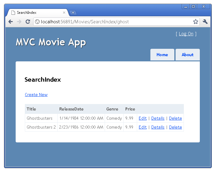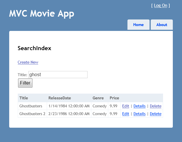 Führen Sie die Anwendung aus, und navigieren Sie zu /Movies/SearchIndex. Fügen Sie eine Abfragezeichenfolge wie ?searchString=ghost an die URL an. Die gefilterten Filme werden angezeigt.