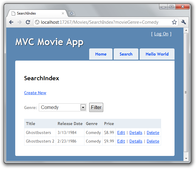 In diesem Abschnitt untersuchen Sie die generierten Aktionsmethoden und -ansichten für den Filmcontroller. Anschließend fügen Sie eine benutzerdefinierte Suchseite hinzu.