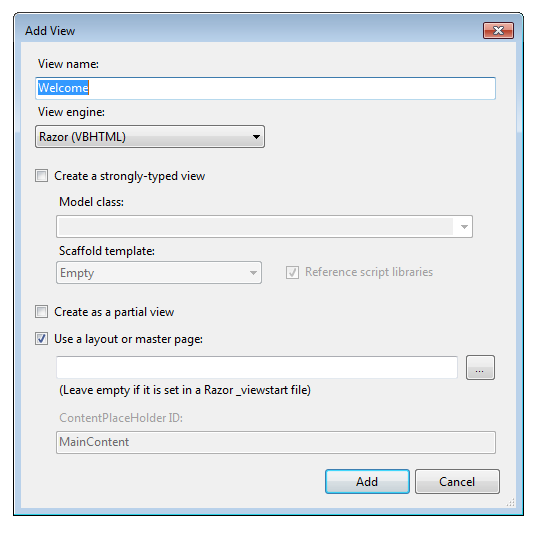 Jetzt benötigen wir eine WelcomeView Vorlage! Führen Sie die Anwendung aus, damit der neue Code kompiliert wird. Schließen Sie den Browser, klicken Sie mit der rechten Maustaste in die Welcome Methode, und klicken Sie dann auf " Ansicht hinzufügen".