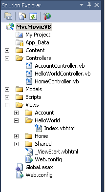 Der Ordner "MvcMovie\Views\HelloWorld " und die Datei "MvcMovie\Views\HelloWorld\Index.vbhtml " werden erstellt. Sie können sie in Projektmappen-Explorer sehen:
