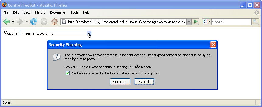 Das CascadingDropDown-Steuerelement im AJAX Control Toolkit erweitert ein DropDownList-Steuerelement, sodass Änderungen in einer DropDownList zugeordnete Werte in einer anderen DropDownList laden. (Für instance enthält eine Liste eine Liste der US-Bundesstaaten, und die nächste Liste wird dann mit den wichtigsten Städten in diesem Bundesstaat gefüllt.) Bei Verwendung des CascadingDropDown-Steuerelements wird ASP. Das AutoPostBack-Feature des DropDownList-Steuerelements von NET funktioniert nicht, da das asynchrone Laden von Daten in die Liste selbst ein (unnötiges) Postback generiert. Mit etwas JavaScript-Code kann dieser Effekt vermieden werden.
