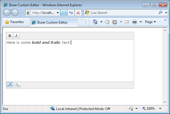 Sie passen die Symbolleistenschaltflächen an, indem Sie einen neuen HTML-Editor von der Editor-Basisklasse ableiten. Beispielsweise enthält der benutzerdefinierte Editor in Listing 2 nur Symbolleistenschaltflächen für Fett und Kursiv. Alle anderen Symbolleistenschaltflächen wurden entfernt. Darüber hinaus wurde die Registerkarte HTML am unteren Rand des Editors entfernt (die Registerkarten Design und Vorschau sind jedoch noch vorhanden).