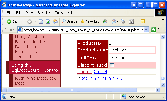Ebenso können Sie das aktuell ausgewählte Produkt löschen oder dem System ein neues Produkt hinzufügen. Da die InsertCommand Anweisung nur mit den ProductName, UnitPrice und Discontinued Spalten funktioniert, haben die anderen Spalten entweder NULL oder ihren Standardwert, der von der Datenbank beim Einfügen zugewiesen wird. Genau wie bei ObjectDataSource tritt beim Ausführen der InsertCommand Anweisung ein SQL-Fehler auf, wenn keine NULL Datenbanktabellenspalten vorhanden sind, die nicht zulassen INSERT und keinen Standardwert aufweisen.