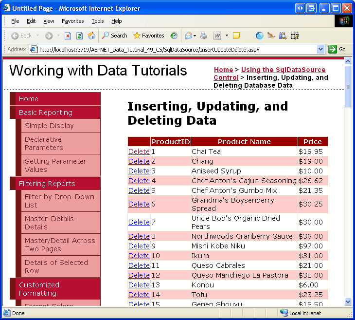 Beim Klicken auf eine Schaltfläche "Löschen" tritt ein Postback auf, das GridView weist den Parameter dem ProductID Wert des DataKeys Sammlungswerts für die Zeile zu, auf deren Schaltfläche "Löschen" geklickt wurde, und ruft die SqlDataSource-Methode Delete() auf. Das SqlDataSource-Steuerelement stellt dann eine Verbindung mit der Datenbank und führt die DELETE Anweisung aus. Das GridView-Objekt wird dann erneut an die SqlDataSource gebunden, und der aktuelle Satz von Produkten wird wieder angezeigt (der den soeben gelöschten Datensatz nicht mehr enthält).
