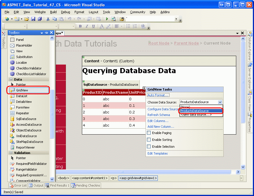 Nachdem die SqlDataSource konfiguriert wurde, kann sie an ein Datenwebsteuerelement gebunden werden, z. B. gridView oder DetailsView. In diesem Lernprogramm zeigen wir die Daten in einer GridView an. Ziehen Sie aus der Toolbox ein GridView-Steuerelement auf das Zeichenblatt, und binden Sie es an ProductsDataSource die SqlDataSource, indem Sie die Datenquelle aus der Dropdownliste im Smarttag von GridView auswählen.