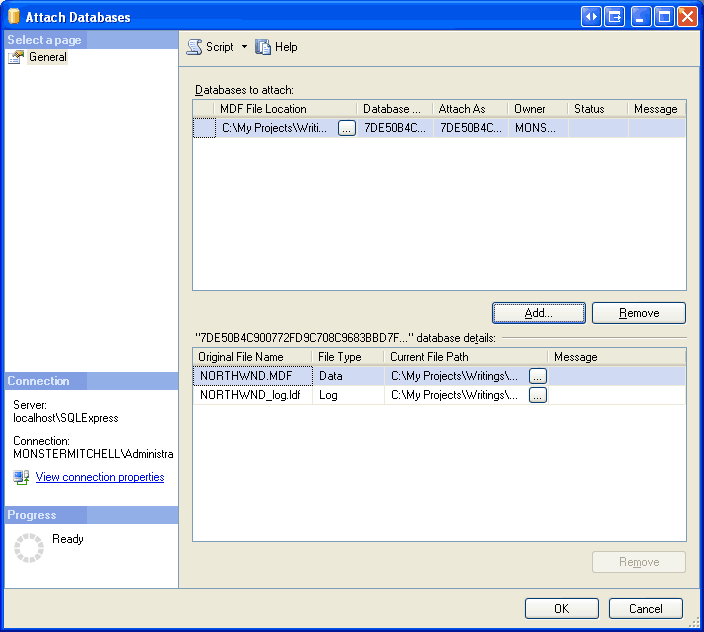 Die Northwind-Datenbank muss an die DataFiles SQL Server 2005 Express Edition-Datenbankinstanz angefügt werden (oder wo auch immer Sie sie verschoben haben). Klicken Sie mit der rechten Maustaste auf den Ordner "Datenbanken", und wählen Sie im Kontextmenü die Option "Anfügen" aus. Dadurch wird das Dialogfeld "Datenbanken anfügen" angezeigt. Klicken Sie auf die Schaltfläche "Hinzufügen", führen Sie einen Drilldown zur entsprechenden NORTHWND.MDF Datei aus, und klicken Sie auf "OK". An diesem Punkt sollte ihr Bildschirm ähnlich aussehen wie in Abbildung 2.