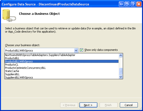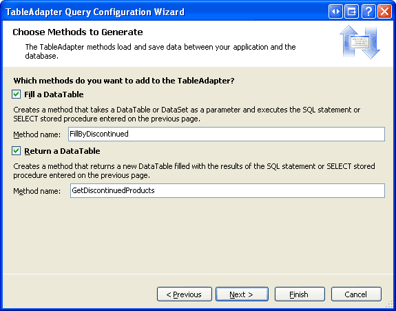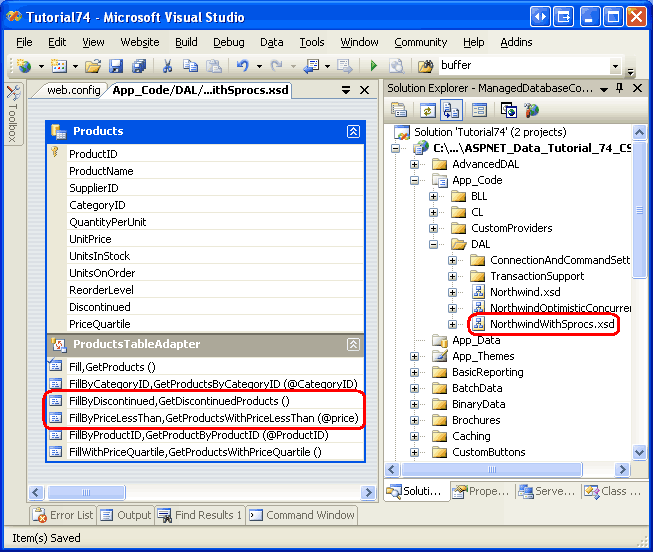 Verwaltete Datenbankobjekte eignen sich am besten für gespeicherte Prozeduren und UDFs, die Prozedurlogik anstelle von setbasierter Logik verwenden. Die prozedurale Logik umfasst das Arbeiten mit Datensätzen auf Zeilenbasis oder das Arbeiten mit skalaren Daten. Die GetDiscontinuedProducts soeben erstellte Methode umfasst jedoch keine prozedurale Logik. Daher wäre sie idealerweise als gespeicherte T-SQL-Prozedur implementiert. Sie wird als verwaltete gespeicherte Prozedur implementiert, um die erforderlichen Schritte zum Erstellen und Bereitstellen von verwalteten gespeicherten Prozeduren zu veranschaulichen.