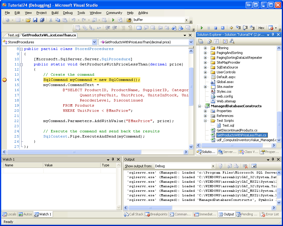 Microsoft SQL Server 2005 ist in die .NET Common Language Runtime integriert, damit Entwickler Datenbankobjekte über verwalteten Code erstellen können. In diesem Lernprogramm wird gezeigt, wie Sie verwaltete gespeicherte Prozeduren und verwaltete benutzerdefinierte Funktionen mit Ihrem Visual Basic- oder C#-Code erstellen. Außerdem erfahren Sie, wie Sie mit diesen Editionen von Visual Studio solche verwalteten Datenbankobjekte debuggen können.