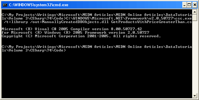 C:\WINDOWS\Microsoft.NET\Framework\v2.0.50727\csc.exe /t:library /out:ManuallyCreatedDBObjects.dll GetProductsWithPriceGreaterThan.cs