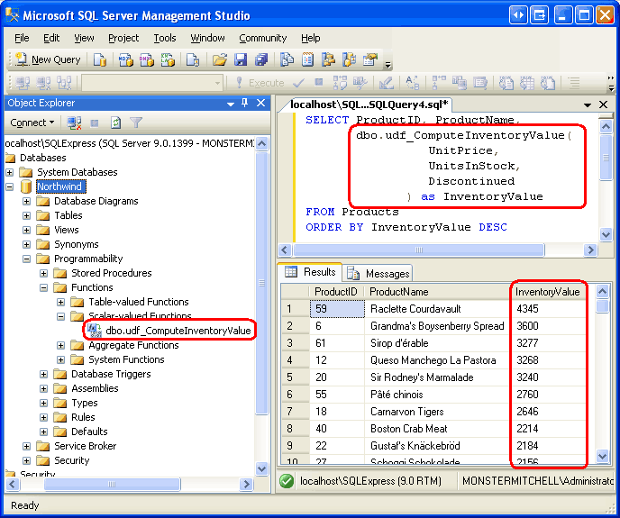 Beachten Sie, dass die Eingabeparameter der UDF-Methode die entsprechenden SQL-Typen aufweisen: SqlMoney für das UnitPrice Feld, SqlInt16 für UnitsInStockund SqlBoolean für Discontinued. Diese Datentypen spiegeln die in der Products Tabelle definierten Typen wider: die UnitPrice Spalte ist vom Typ, der UnitsInStock Spalte vom Typ moneysmallintund der Discontinued Spalte des Typsbit.