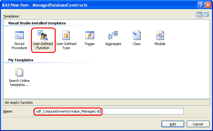 Die udf_ComputeInventoryValue in den obigen Beispielen erstellten UND udf_GetProductsByCategoryID UDFs sind T-SQL-Datenbankobjekte. SQL Server 2005 unterstützt auch verwaltete UDFs, die dem Projekt wie die verwalteten gespeicherten Prozeduren aus schritt 3 und 5 hinzugefügt ManagedDatabaseConstructs werden können. Für diesen Schritt implementieren wir die udf_ComputeInventoryValue UDF in verwaltetem Code.
