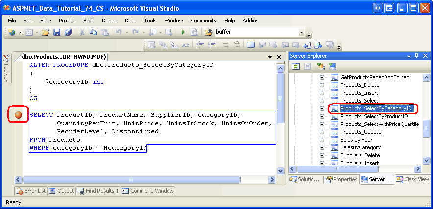 Abbildung 4: Festlegen eines Haltepunkts in der Products_SelectByCategoryID gespeicherten Prozedur (Klicken Sie hier, um das Bild in voller Größe anzuzeigen)
