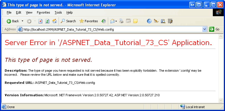Da Web.config vertrauliche Daten wie Verbindungszeichenfolge enthalten können, ist es wichtig, dass die Inhalte Web.config geschützt und vor nicht autorisierten Betrachtern verborgen bleiben. Standardmäßig wird jede HTTP-Anforderung an eine Datei mit der .config Erweiterung vom Modul ASP.NET behandelt, das die Meldung Dieser Seitentyp wird nicht bereitgestellt, wie in Abbildung 1 gezeigt, zurückgibt. Dies bedeutet, dass Besucher Ihre Web.config Dateiinhalte nicht anzeigen können, indem sie einfach die Adressleiste ihres Browsers eingeben http://www.YourServer.com/Web.config .