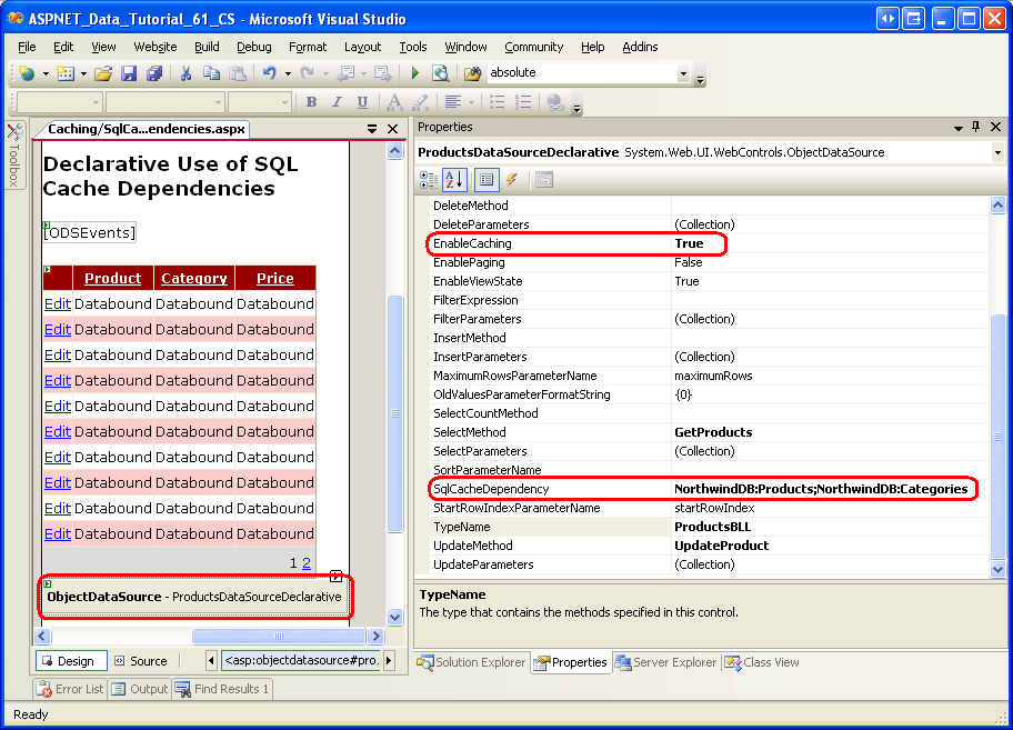 Im Lernprogramm zur Zwischenspeicherung von Daten mit der ObjectDataSource wurden die deklarativen Caching-Funktionen der ObjectDataSource behandelt. Durch einfaches Festlegen der EnableCaching Eigenschaft auf True und die CacheDuration Eigenschaft auf ein bestimmtes Zeitintervall speichert ObjectDataSource automatisch die daten, die vom zugrunde liegenden Objekt für das angegebene Intervall zurückgegeben werden. Die ObjectDataSource kann auch eine oder mehrere SQL-Cacheabhängigkeiten verwenden.