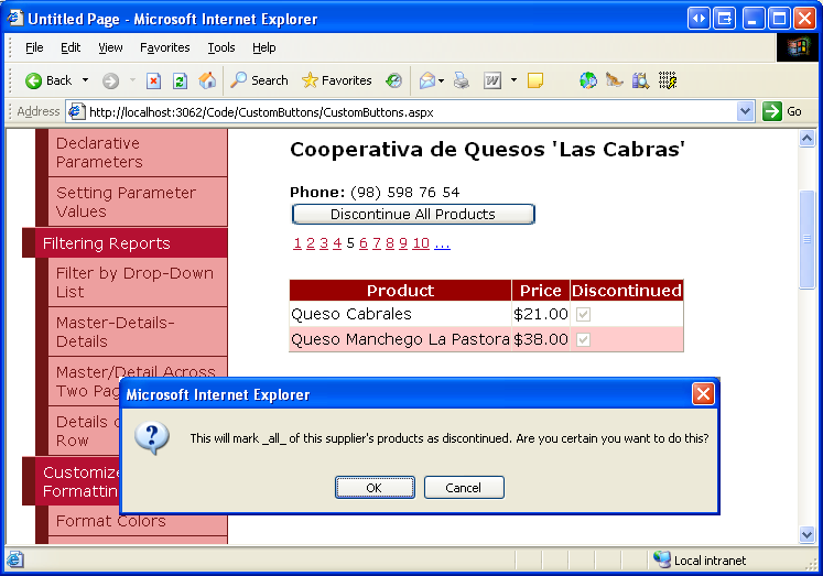Stellen Sie sich vor, dass die Cooperativa de Quesos 'Las Cabras' aus dem Geschäft gegangen ist und daher ihre Produkte eingestellt werden sollen. Klicken Sie auf die Schaltfläche "Alle Produkte beenden". Dadurch wird das clientseitige Bestätigungsdialogfeld angezeigt (siehe Abbildung 16).