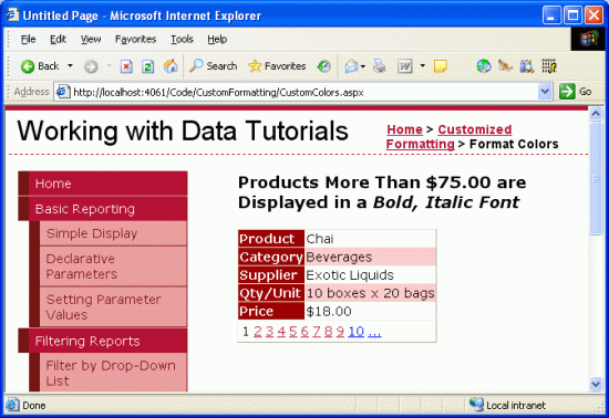 Im letzten Schritt wird das gesamte GridViewRow programmatisch hervorgehoben, wenn der UnitPrice Wert für die betreffende Zeile kleiner als 10,00 $ ist. Die Syntax für den Zugriff auf die Zeilen oder Zellen eines GridView-Steuerelements ist dieselbe wie bei der DetailsView: GridViewID.Rows(index) um auf die gesamte Zeile zuzugreifen, GridViewID.Rows(index).Cells(index) um auf eine bestimmte Zelle zuzugreifen. Wenn der RowDataBound Ereignishandler jedoch ausgelöst wird, sind die gebundenen GridViewRow noch nicht der GridView-Auflistung Rows hinzugefügt worden. Daher können Sie nicht mit der Rows-Sammlung im GridViewRow Ereignishandler auf die RowDataBound aktuelle Instanz zugreifen.