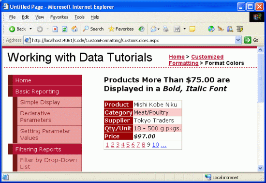An diesem Punkt können wir ermitteln, ob der an die DetailsView gebundene Wert einen Wert aufweist, der UnitPrice 75,00 $ überschreitet, aber wir haben noch nicht gesehen, wie die Formatierung von DetailsView programmgesteuert angepasst wird. Um die Formatierung einer gesamten Zeile in der DetailsView zu ändern, greifen Sie programmgesteuert auf die Zeile zu, indem Sie DetailsViewID.Rows(index) verwenden; um eine bestimmte Zelle zu ändern, verwenden Sie DetailsViewID.Rows(index).Cells(index). Sobald wir einen Verweis auf die Zeile oder Zelle haben, können wir die Darstellung anpassen, indem wir die formatbezogenen Eigenschaften festlegen.