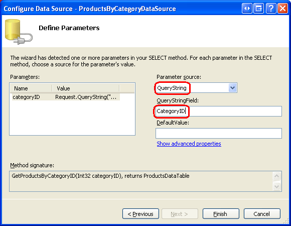 Der letzte Schritt des Assistenten zum Konfigurieren der Datenquelle fordert die Quelle des productID-Parameters auf. Da diese Daten durch das Abfragezeichenfolgenfeld ProductIDkommen, legen Sie die Dropdownliste auf QueryString und das QueryStringField-Textfeld auf "ProductID" fest. Klicken Sie abschließend auf die Schaltfläche "Fertig stellen", um den Assistenten abzuschließen.