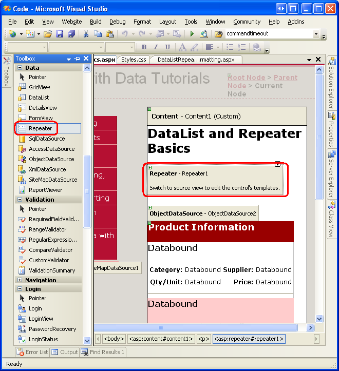 Um dies zu erreichen, ziehen Sie zunächst ein Repeater-Steuerelement aus der Toolbox auf den Designer, oberhalb der Produktinformationsdatenliste. Wie bei der DataList wird der Repeater zunächst als graues Feld angezeigt, bis seine Vorlagen definiert wurden.