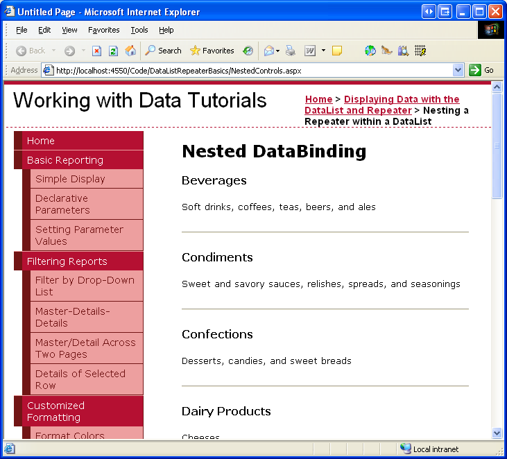 In diesem Lernprogramm erfahren Sie, wie Sie einen Repeater verwenden, der in einem anderen Repeater geschachtelt ist. Der äußere Repeater enthält ein Element für jede Kategorie in der Datenbank, wobei der Name und die Beschreibung der Kategorie angezeigt werden. Jeder interne Repeater der Kategorie zeigt Informationen für jedes Produkt an, das zu dieser Kategorie gehört (siehe Abbildung 1) in einer Aufzählung. In unseren Beispielen wird veranschaulicht, wie der innere Repeater sowohl deklarativ als auch programmgesteuert aufgefüllt wird.