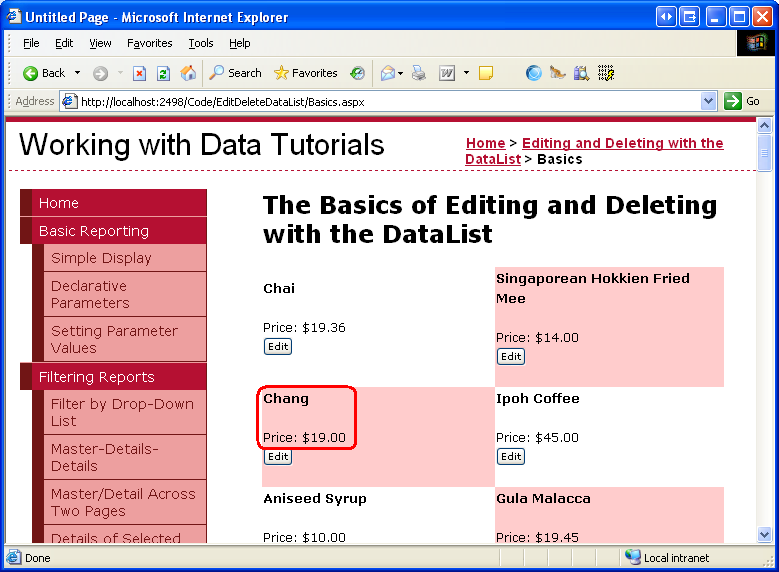 Während die DataList den Punkt fehlt und auf bearbeitungs- und löschunterstützung klickt, die von GridView genossen wird, kann es mit einem kurzen Codebit erweitert werden, um diese Features einzuschließen. In diesem Lernprogramm haben wir erfahren, wie Sie eine zweispaltige Auflistung von Produkten erstellen, die gelöscht werden können und deren Name und Preis bearbeitet werden konnten. Das Hinzufügen von Bearbeitungs- und Löschunterstützung ist eine Frage der Einbeziehung der entsprechenden Websteuerelemente in die ItemTemplate und EditItemTemplate, das Erstellen der entsprechenden Ereignishandler, das Lesen der vom Benutzer eingegebenen und Primärschlüsselwerte und die Interoperabilität mit der Geschäftslogikebene.
