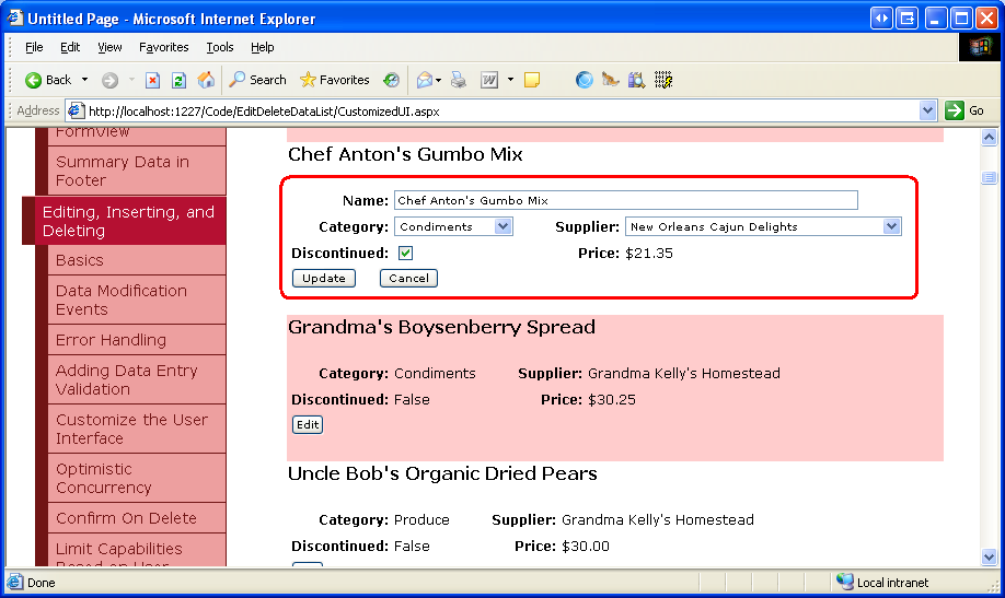 Weisen Sie den Wert des ProductName Datenfelds der ProductName Eigenschaft "TextBox"Text, den Eigenschaften und CategoryID den SupplierIDCategories Eigenschaften "DropDownLists" und Suppliers dem Wert des SelectedValue Datenfelds Discontinued der Discontinued CheckBox-Eigenschaft Checked zu. Nachdem Sie diese Änderungen vorgenommen haben, entweder über den Designer oder direkt über das deklarative Markup, überprüfen Sie die Seite über einen Browser, und klicken Sie auf die Schaltfläche "Bearbeiten" für Chef Anton s Gumbo Mix. Wie in Abbildung 9 dargestellt, hat die Syntax für die Datenbindung die aktuellen Werte zu TextBox, DropDownLists und CheckBox hinzugefügt.
