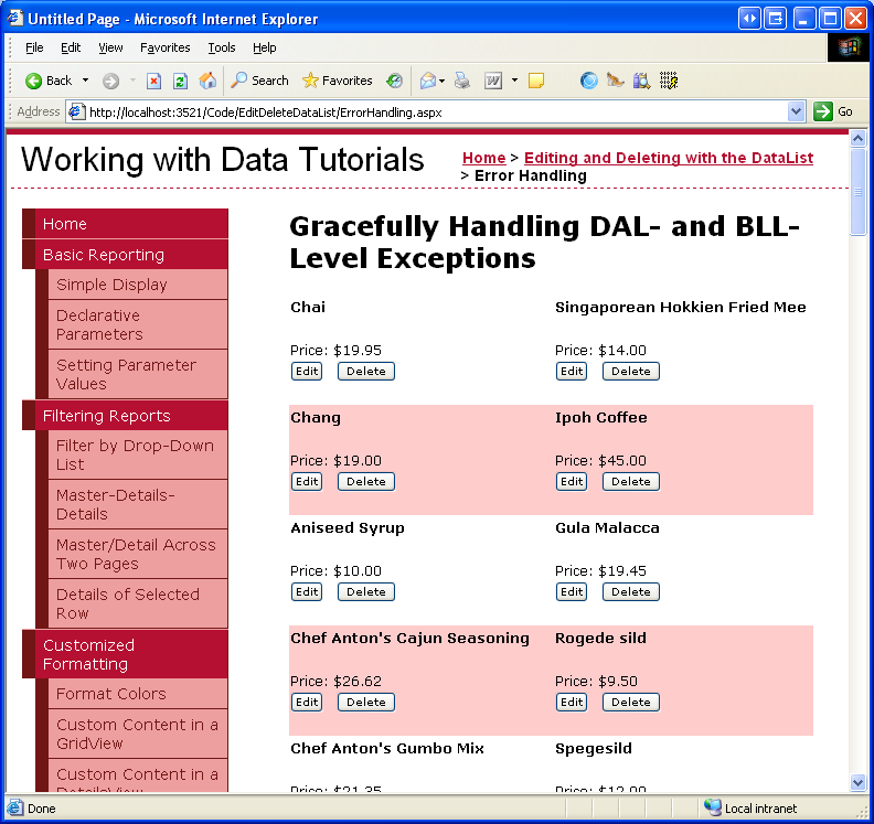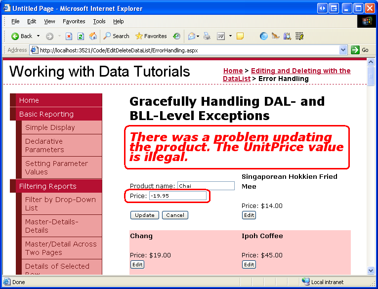 GridView und ObjectDataSource stellen Ereignishandler auf Ebene der Ebene bereit, die Informationen zu ausnahmen enthalten, die während des Aktualisierungs- und Löschworkflows ausgelöst wurden, sowie Eigenschaften, die festgelegt werden können, um anzugeben, ob die Ausnahme behandelt wurde. Diese Features sind jedoch nicht verfügbar, wenn Sie mit der DataList arbeiten und die BLL direkt verwenden. Stattdessen sind wir für die Implementierung der Ausnahmebehandlung verantwortlich.