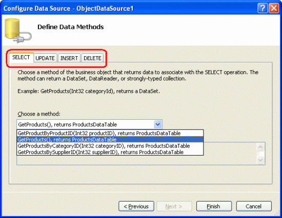 Das DataObjectMethodAttribute Attribut gibt den Zweck jeder Methode an, unabhängig davon, ob sie zum Auswählen, Einfügen, Aktualisieren oder Löschen dient und ob es sich um den Standardwert handelt. Wenn Sie diese Attribute beim Erstellen Ihrer BLL-Klassen weggelassen haben, müssen Sie die Methoden auf den Registerkarten UPDATE, INSERT und DELETE manuell auswählen.