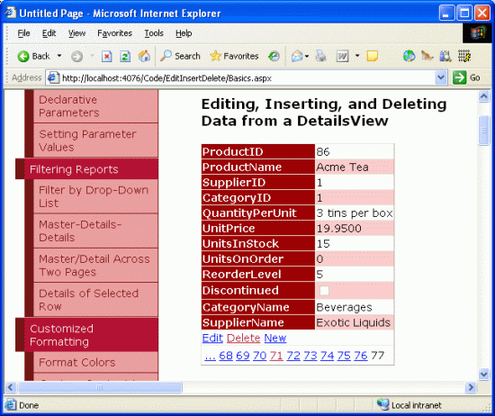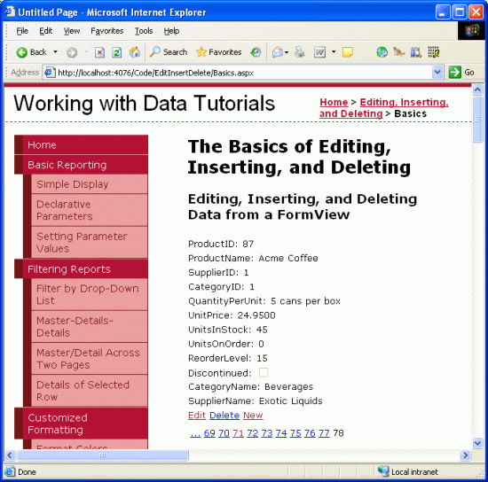 <asp:FormView ID="FormView1" runat="server" DataKeyNames="ProductID" DataSourceID="ObjectDataSource1" AllowPaging="True"> <EditItemTemplate> ... </EditItemTemplate> <InsertItemTemplate> ... </InsertItemTemplate> <ItemTemplate> ProductID: <asp:Label ID="ProductIDLabel" runat="server" Text='<%# Eval("ProductID") %>'></asp:Label><br /> ProductName: <asp:Label ID="ProductNameLabel" runat="server" Text='<%# Bind("ProductName") %>'> </asp:Label><br /> SupplierID: <asp:Label ID="SupplierIDLabel" runat="server" Text='<%# Bind("SupplierID") %>'> </asp:Label><br /> CategoryID: <asp:Label ID="CategoryIDLabel" runat="server" Text='<%# Bind("CategoryID") %>'> </asp:Label><br /> QuantityPerUnit: <asp:Label ID="QuantityPerUnitLabel" runat="server" Text='<%# Bind("QuantityPerUnit") %>'> </asp:Label><br /> UnitPrice: <asp:Label ID="UnitPriceLabel" runat="server" Text='<%# Bind("UnitPrice") %>'></asp:Label><br /> UnitsInStock: <asp:Label ID="UnitsInStockLabel" runat="server" Text='<%# Bind("UnitsInStock") %>'> </asp:Label><br /> UnitsOnOrder: <asp:Label ID="UnitsOnOrderLabel" runat="server" Text='<%# Bind("UnitsOnOrder") %>'> </asp:Label><br /> ReorderLevel: <asp:Label ID="ReorderLevelLabel" runat="server" Text='<%# Bind("ReorderLevel") %>'> </asp:Label><br /> Discontinued: <asp:CheckBox ID="DiscontinuedCheckBox" runat="server" Checked='<%# Bind("Discontinued") %>' Enabled="false" /><br /> CategoryName: <asp:Label ID="CategoryNameLabel" runat="server" Text='<%# Bind("CategoryName") %>'> </asp:Label><br /> SupplierName: <asp:Label ID="SupplierNameLabel" runat="server" Text='<%# Bind("SupplierName") %>'> </asp:Label><br /> <asp:LinkButton ID="EditButton" runat="server" CausesValidation="False" CommandName="Edit" Text="Edit"> </asp:LinkButton> <asp:LinkButton ID="DeleteButton" runat="server" CausesValidation="False" CommandName="Delete" Text="Delete"> </asp:LinkButton> <asp:LinkButton ID="NewButton" runat="server" CausesValidation="False" CommandName="New" Text="New"> </asp:LinkButton> </ItemTemplate> </asp:FormView>