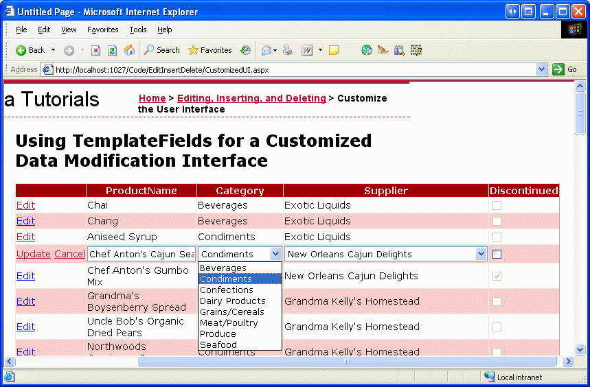 Nachdem die Bindungen auf die SelectedValue Eigenschaften der beiden DropDownLists angewendet wurden, werden die Kategorie- und Lieferantenspalten des bearbeiteten Produkts standardmäßig auf die Werte des aktuellen Produkts angewendet. Beim Klicken auf "Aktualisieren" werden die CategoryID Werte und SupplierID Werte des ausgewählten Dropdownlistenelements an die UpdateProduct Methode übergeben. Abbildung 11 zeigt das Lernprogramm, nachdem die Datenbindungsanweisungen hinzugefügt wurden; beachten Sie, wie die ausgewählten Dropdownlistenelemente für Chef Antons Cajun Seasoning korrekt condiment und New Orleans Cajun Delights sind.